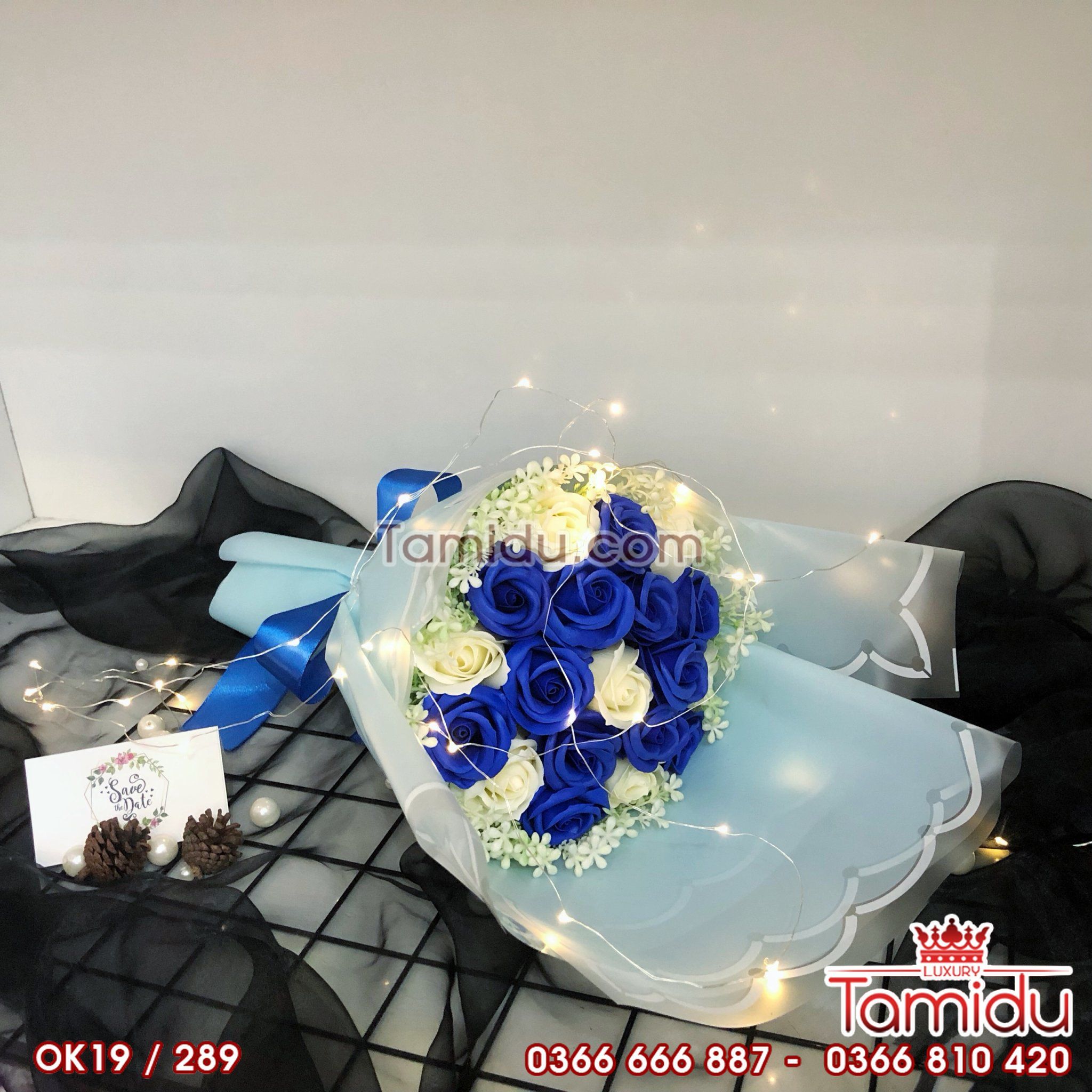 Bó Hoa Hồng Sáp Thơm 19 Bông Có Hoa Kèm Phối Coban Trắng