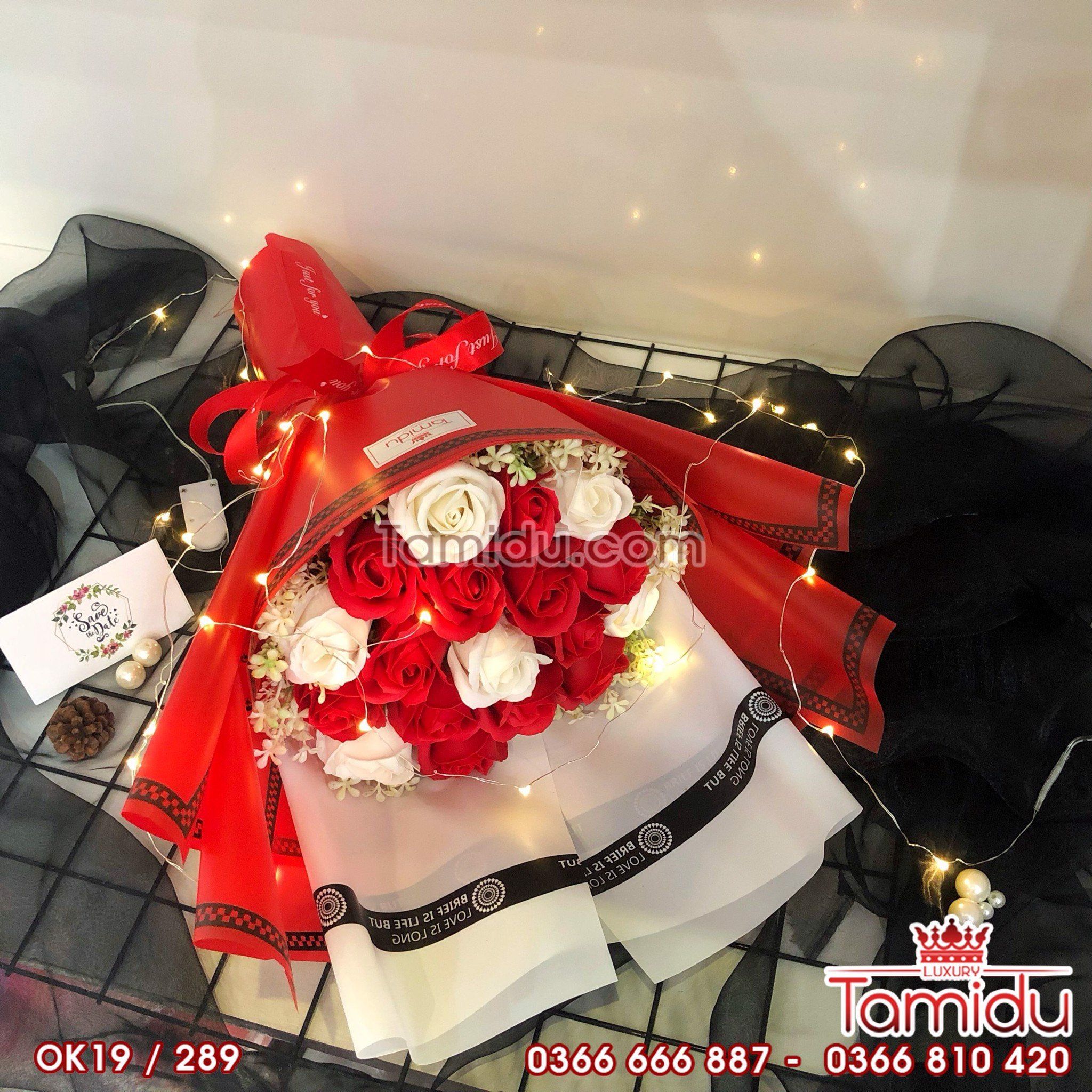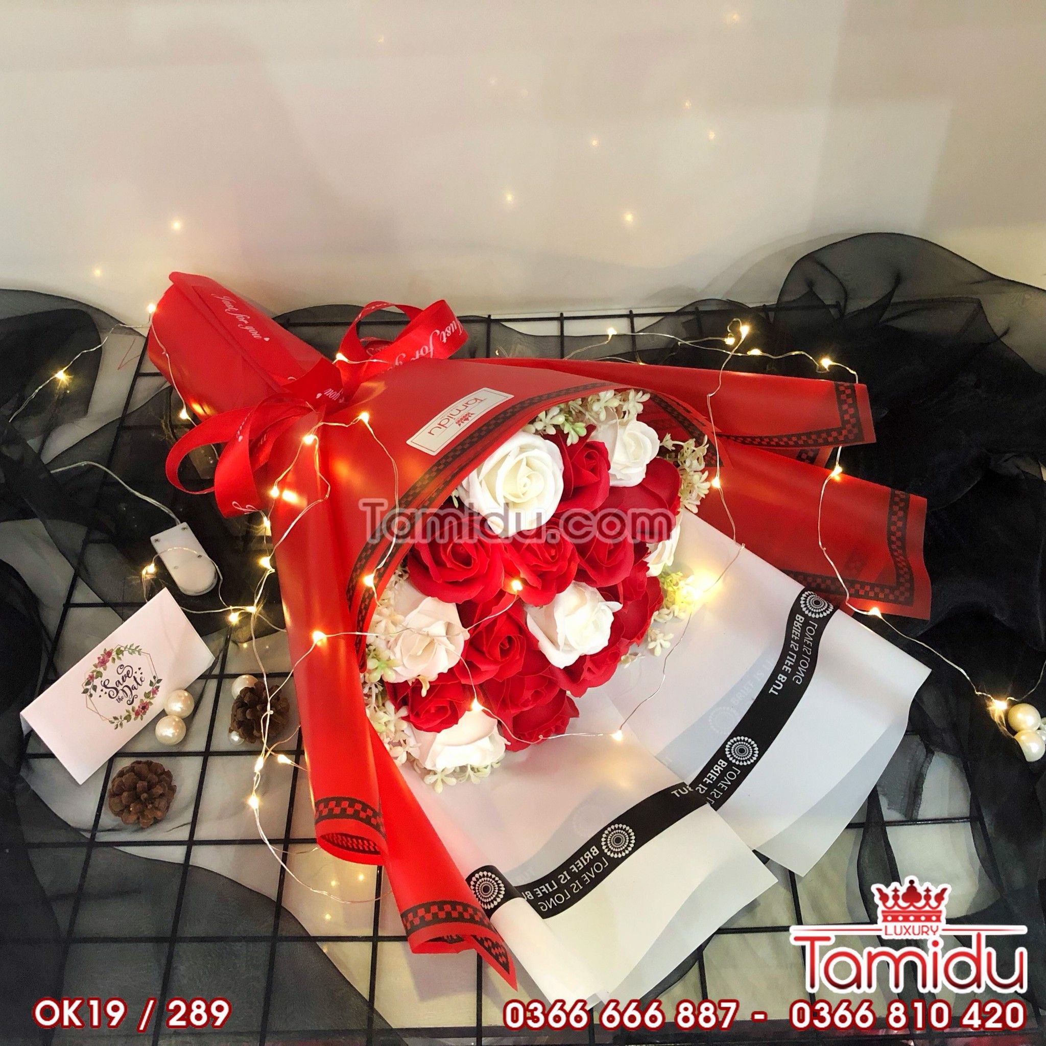 Bó Hoa Hồng Sáp Thơm 19 Bông Có Hoa Kèm Phối Đỏ Trắng