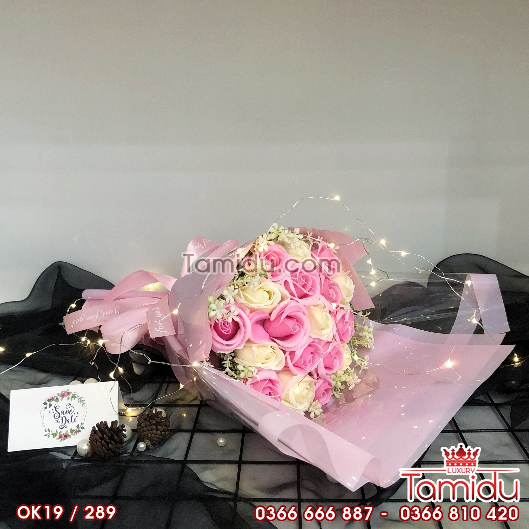 Bó Hoa Hồng Sáp Thơm 19 Bông Có Hoa Kèm Phối Phấn Trắng