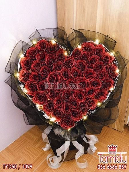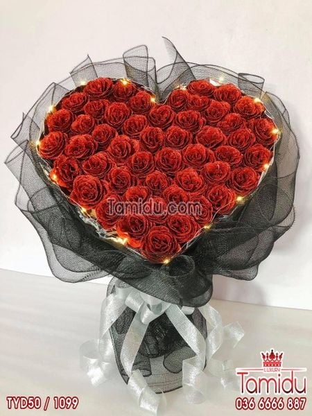 Bó Hoa Kim Tuyến 50 bông Trái Tim Màu Đỏ Có Đèn Cao Cấp