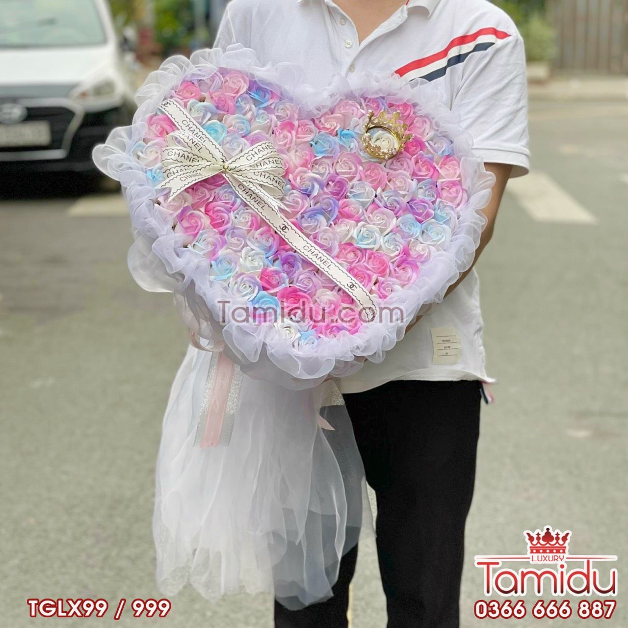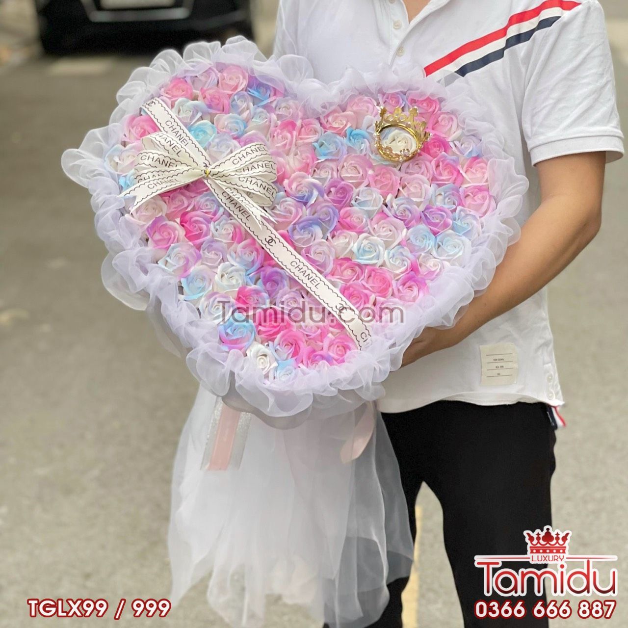 Tạo Hình: bó hoa hình tim, gói voan lụa trắng cao cấp tạo cảm giác bồng bềnh, tặng kèm vương miện