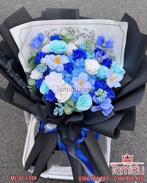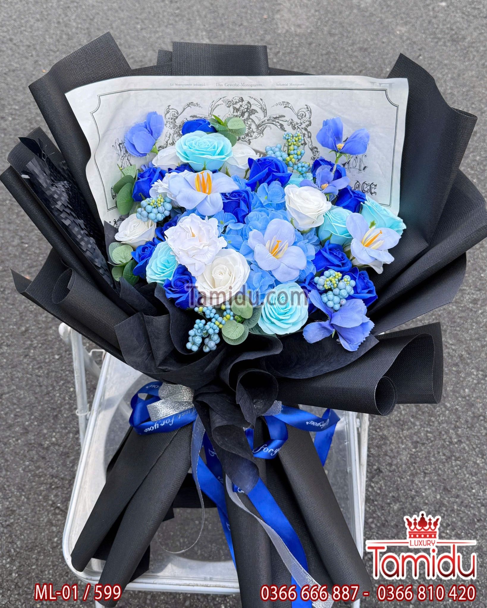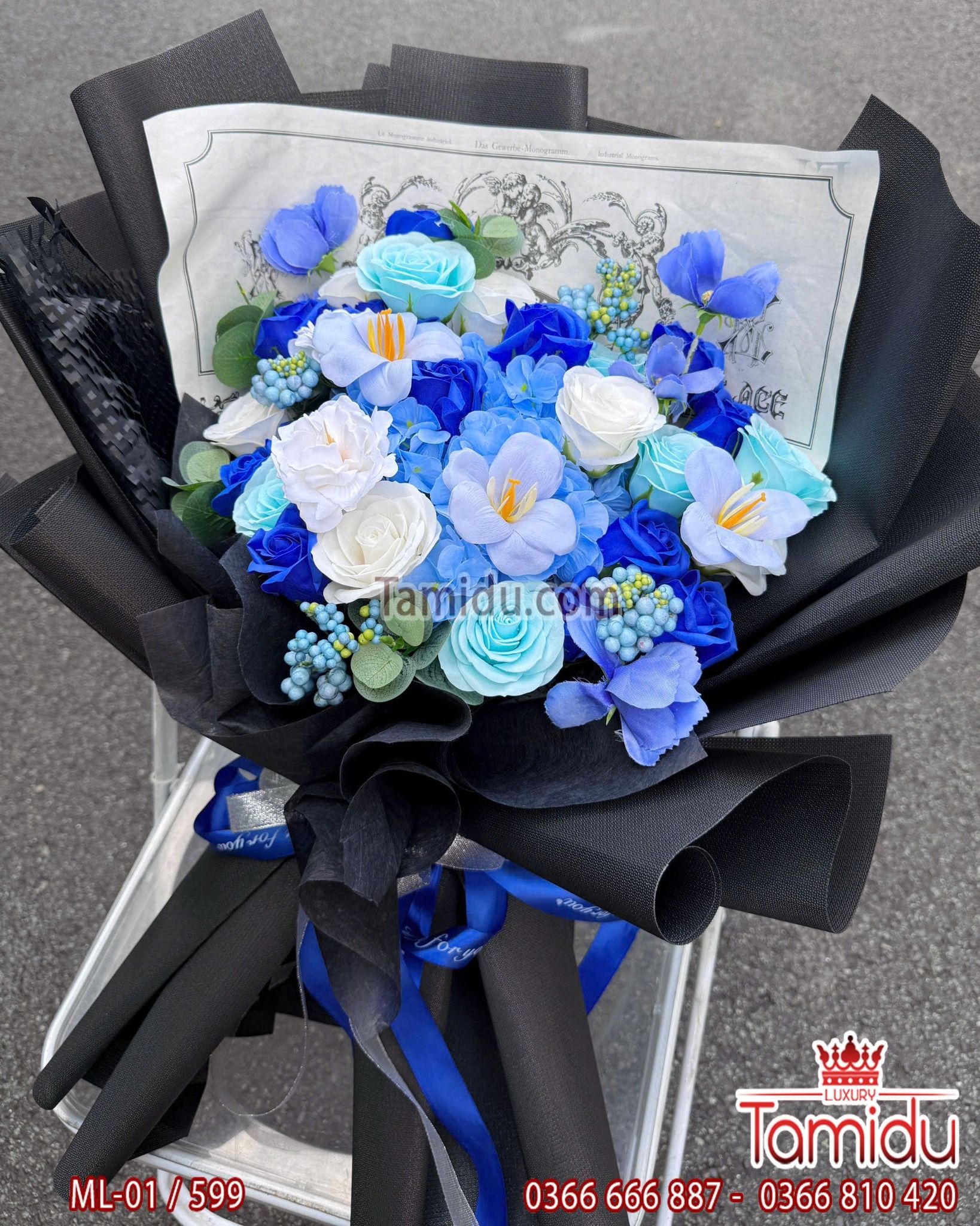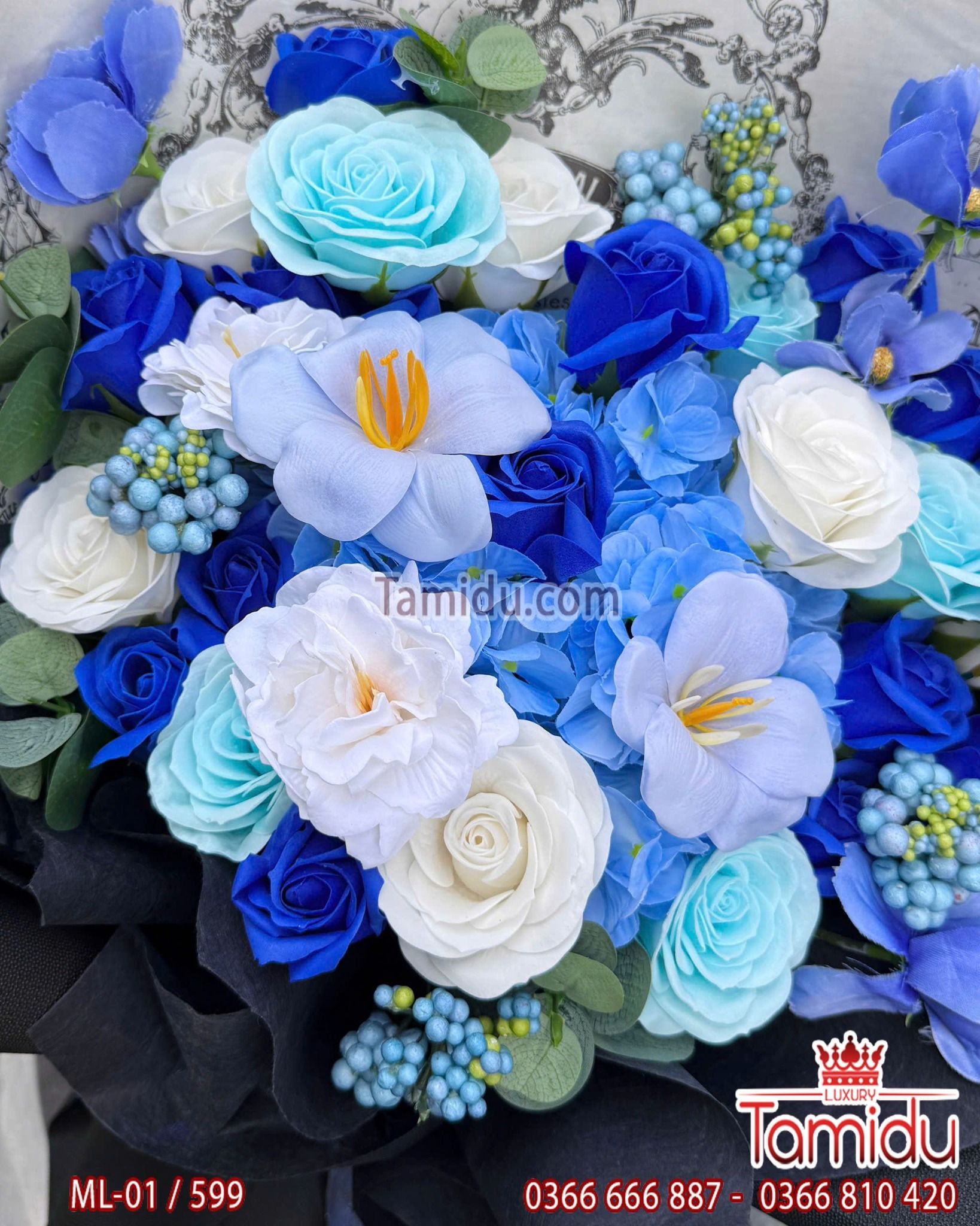 bó hoa sáp mix nhiều loại hoa cao cấp: cẩm tú cầu, hồng xoăn, tulip, đỗ quyên bó hoa mang tone màu xanh huyền bí