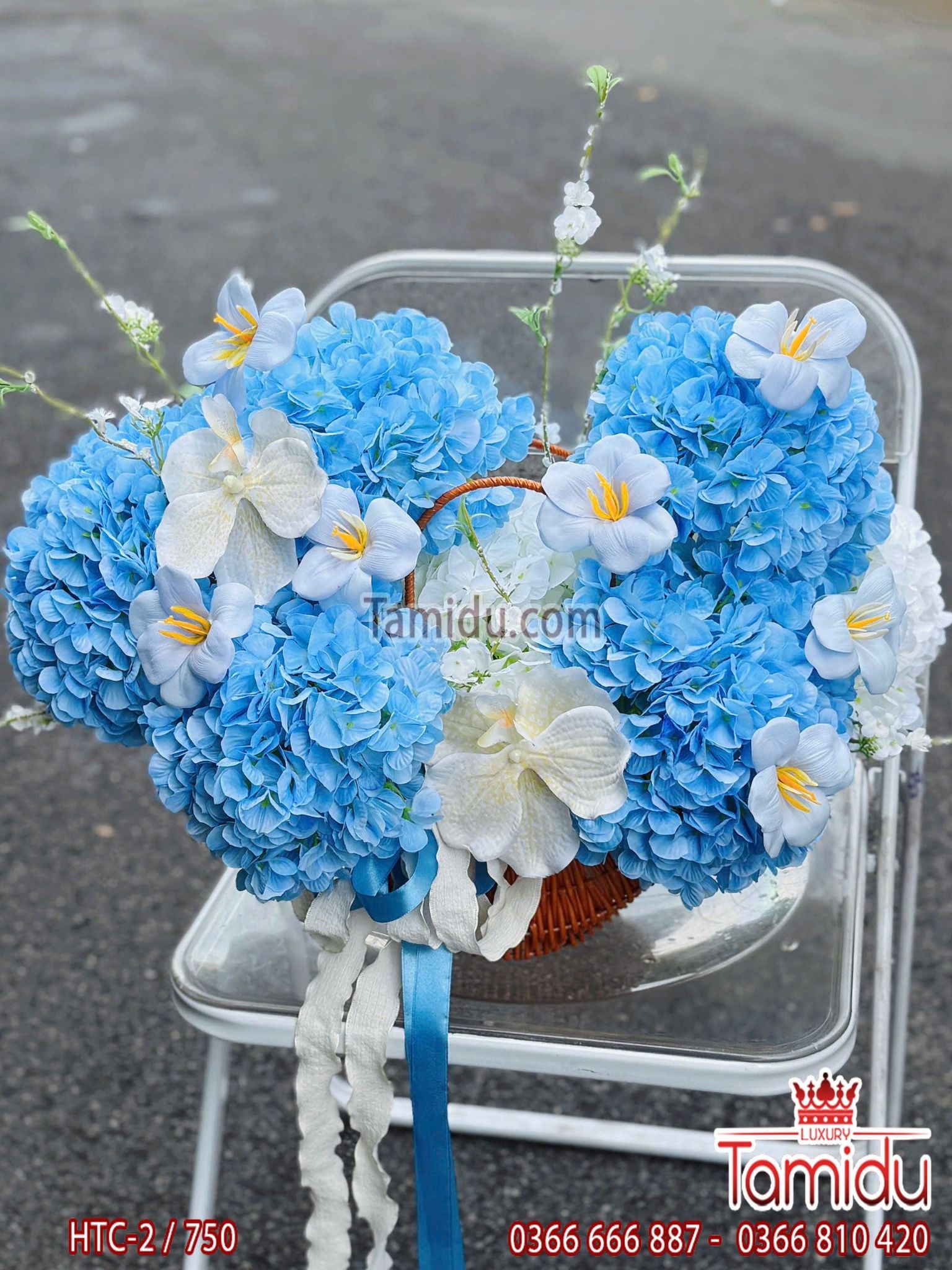 giỏ hoa tú cầu lụa nhẹ nhàng mix cùng hoa tulip ,lan và tuyết mai mang đến cảm giác tươi sáng, sang chảnh