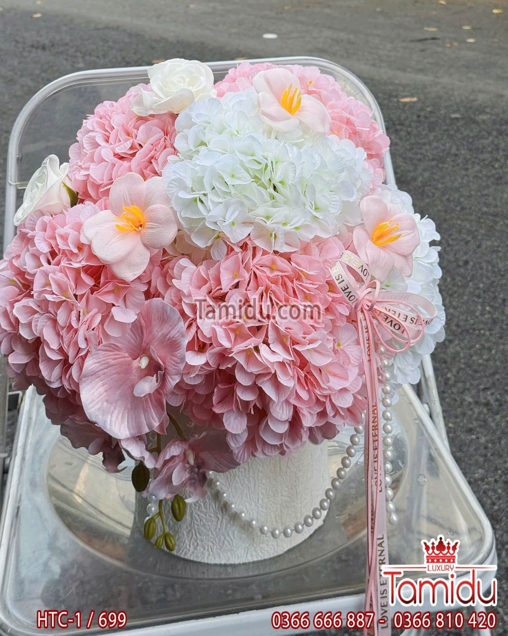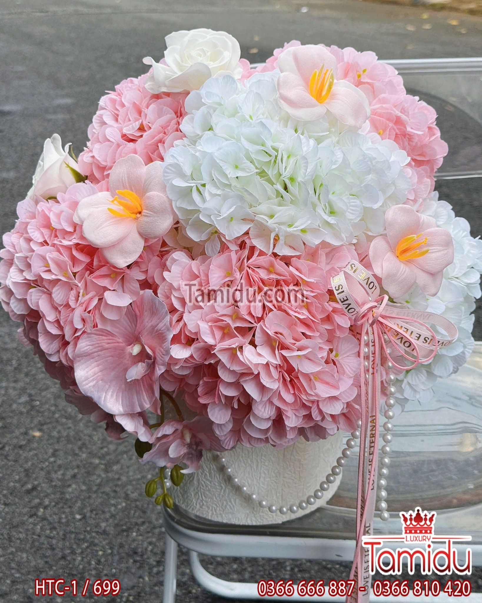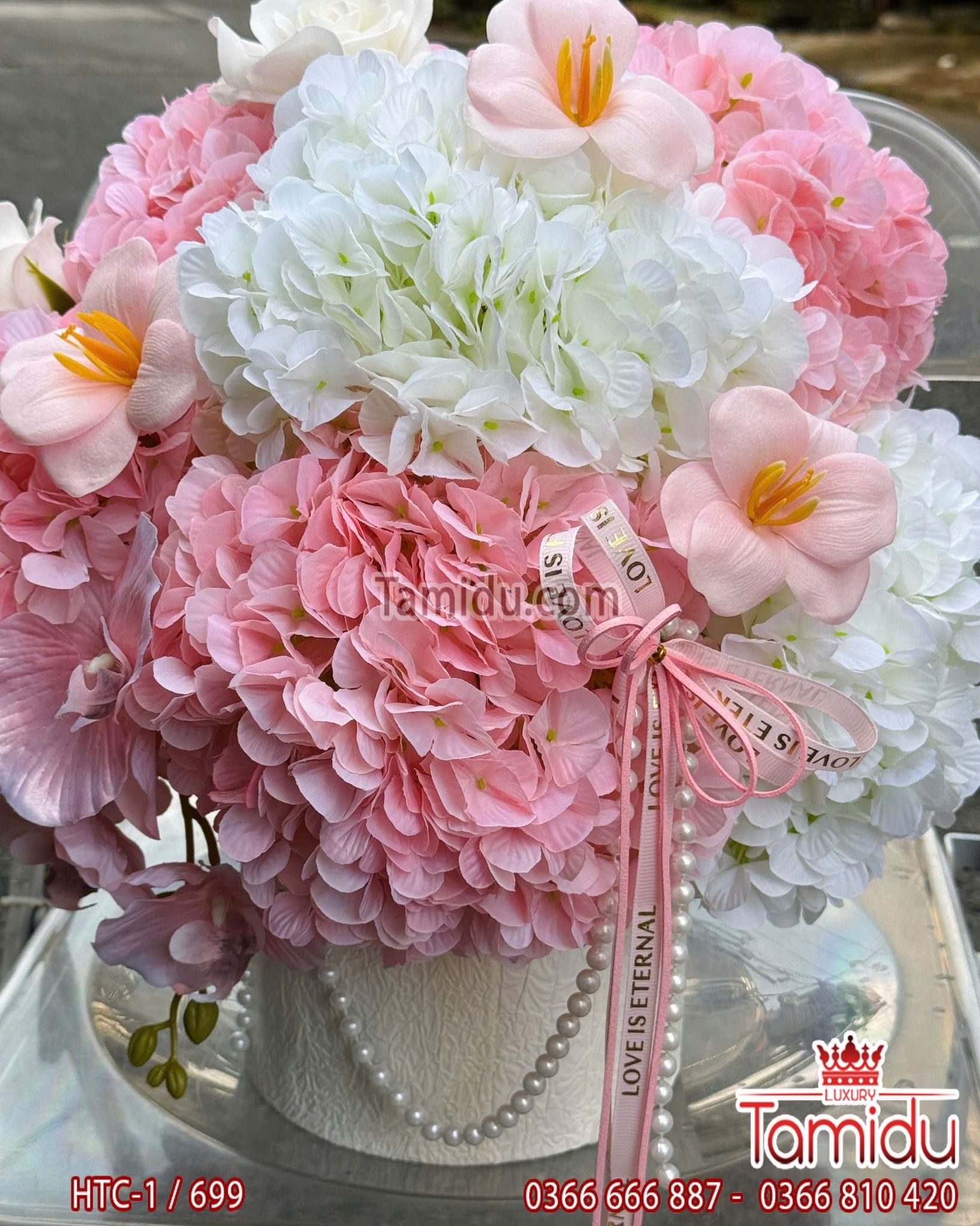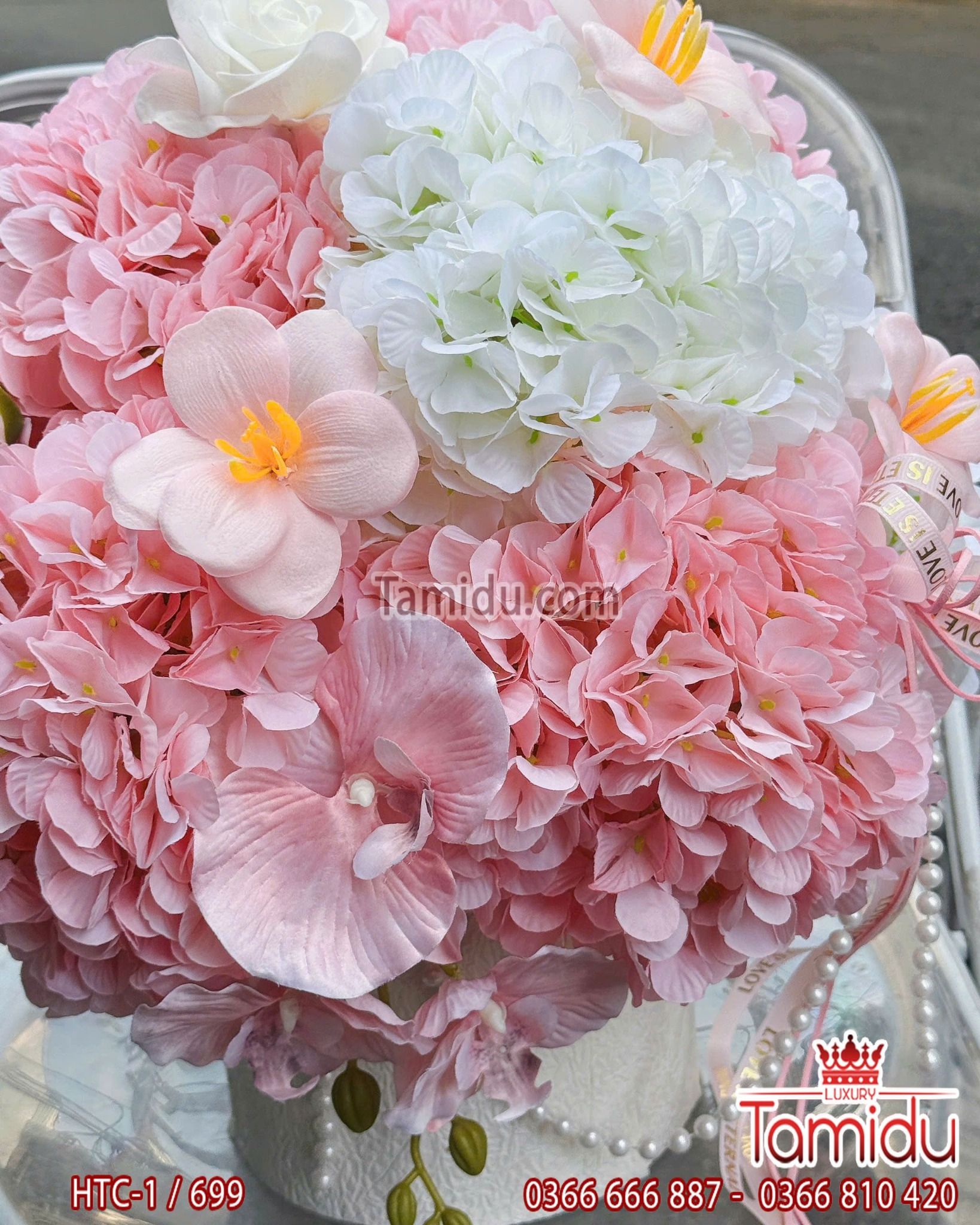 hộp hoa tú cầu lụa nhẹ nhàng xinh xắn, từng bông hoa núng nính như sự dễ thương của nàng