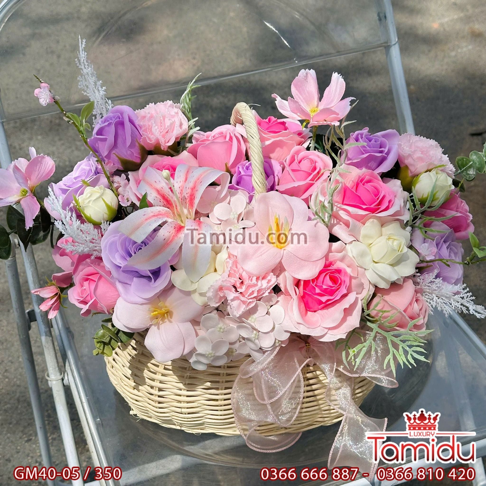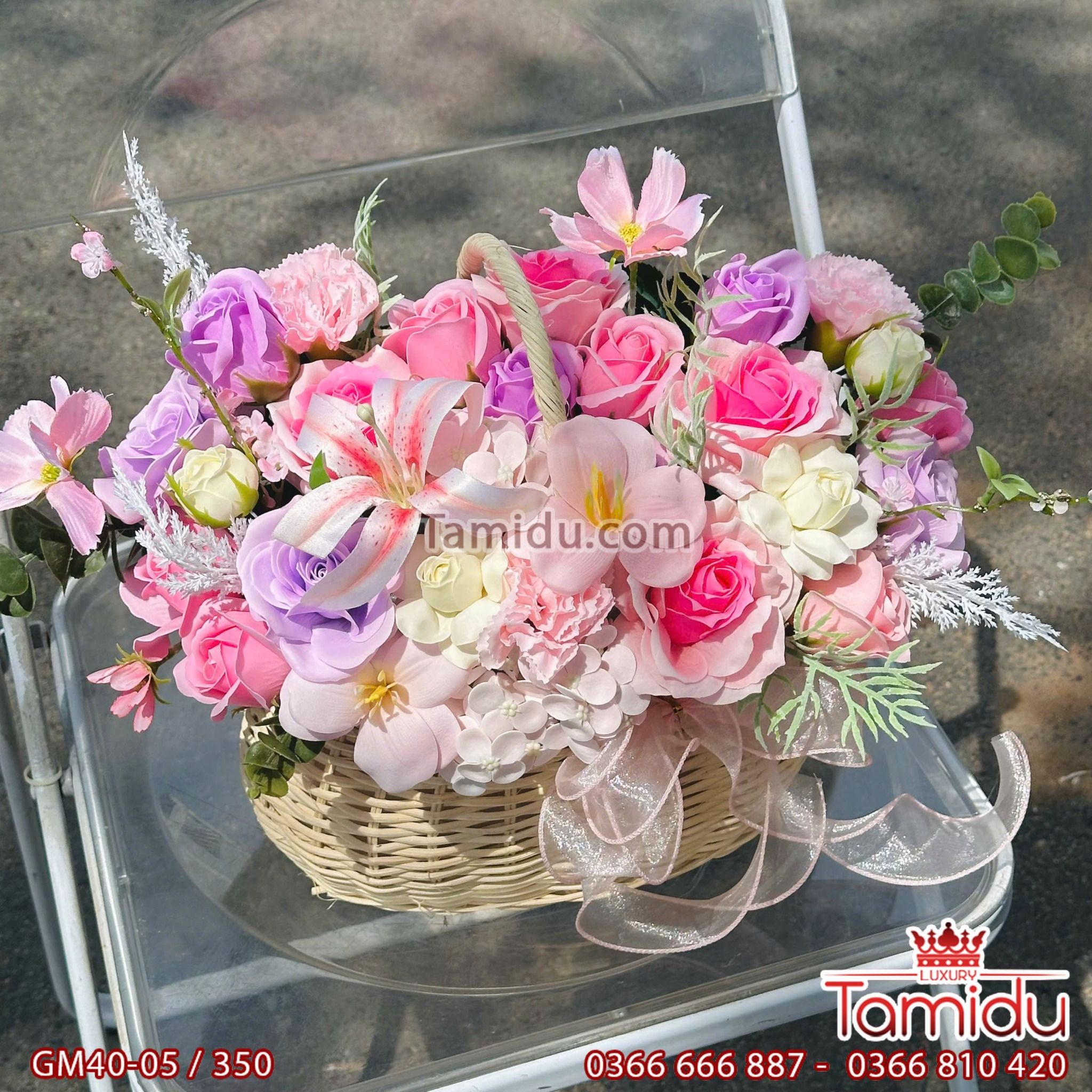 Giỏ hoa hồng sáp mix nhiều loại hoa: hoa hồng, tulip, cẩm chướng, hoa ly,.. tone màu ngọt ngào, mộng mơ